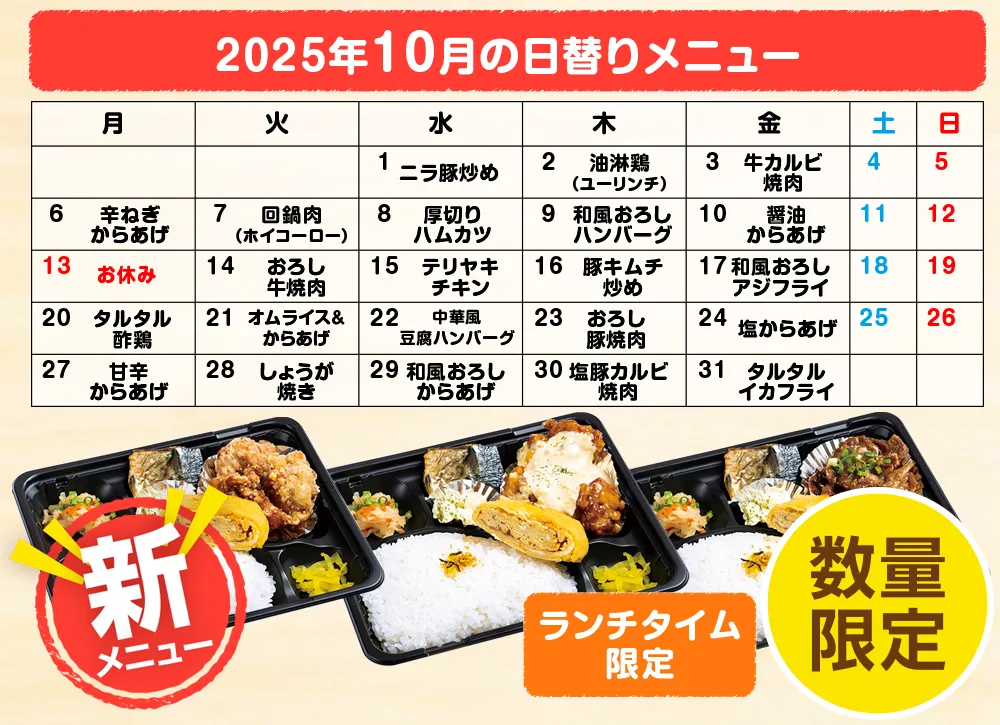 - ※このメニューはご飯の増減はできません。日により内容が変わります。曜日ごとの商品が変更します。